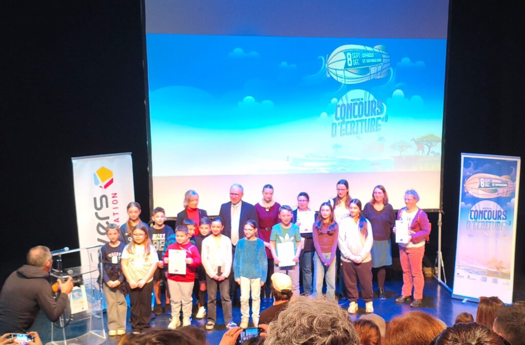 Ci-dessous, la photo des gagnants de toutes les catégories (il y avait différents âges et types d’écriture). Charline est au milieu, en robe grenat.